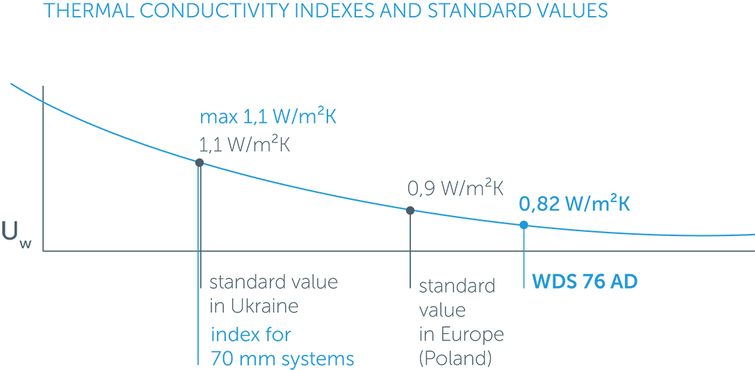 The Ukrainian construction standards are being harmonized with the EU ones. The heat transfer resistance coefficient requirements have become more stringent in Ukraine, coming close to the European level. The best-selling items from our product range currently meet minimally acceptable standards. If the requirements keep rising, the current 70-mm systems won’t be able to keep up with demand.