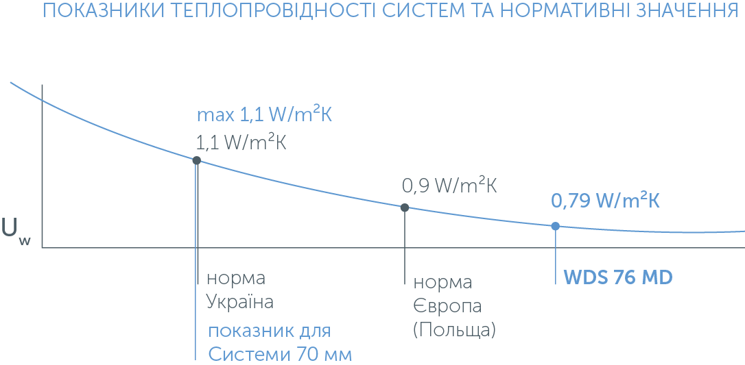 Українські будівельні стандарти уніфікуються зі стандартами ЄС. Вже зараз вимоги до коефіцієнту опору теплопередачі вікон в Україні стали жорсткішими, ближчими до європейських. Наявні бестселери з нашого асортименту наразі відповідають мінімально необхідним нормам. Проте, якщо вимоги суворішатимуть надалі, поточні системи 70 мм вже не будуть задовольняти потреби ринку.